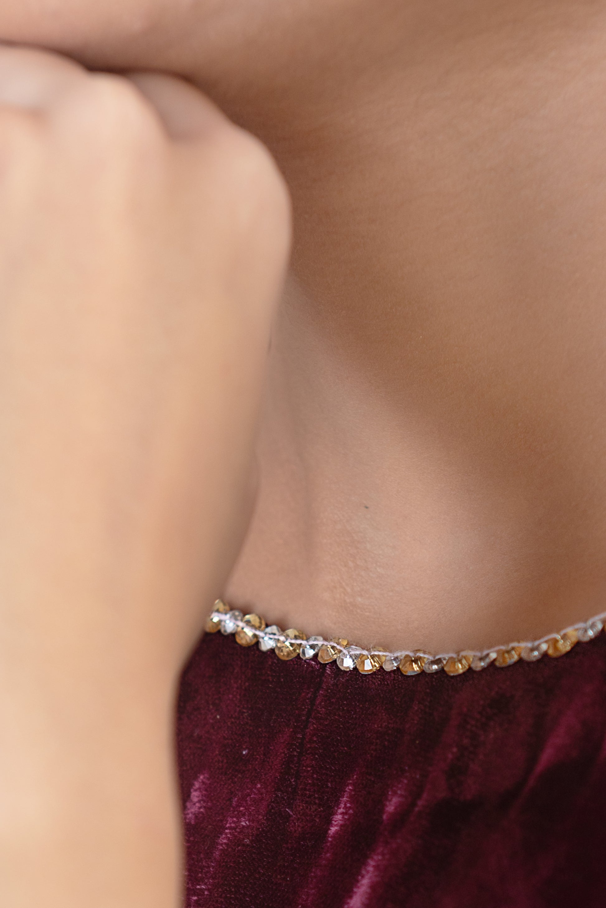 This two-piece suit, crafted in deep burgundy velvet, features a long shirt adorned with silver and golden stone spray embellishments across the front, creating a subtle yet elegant shine.